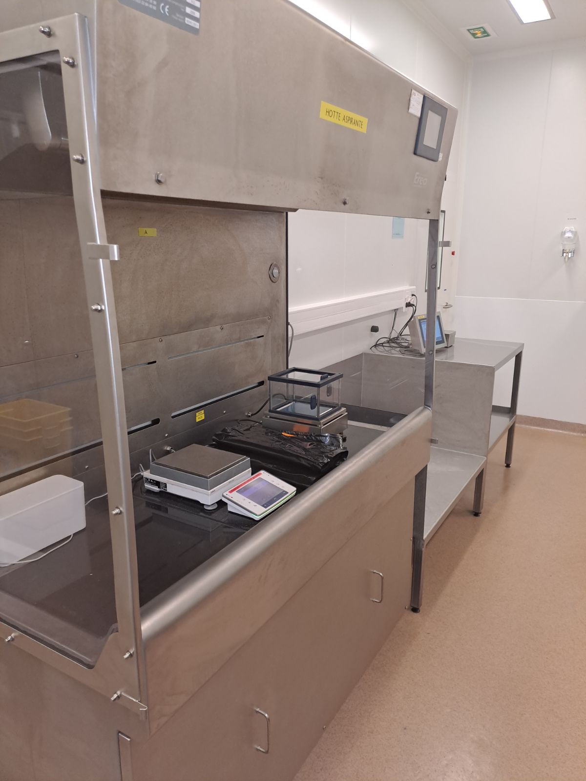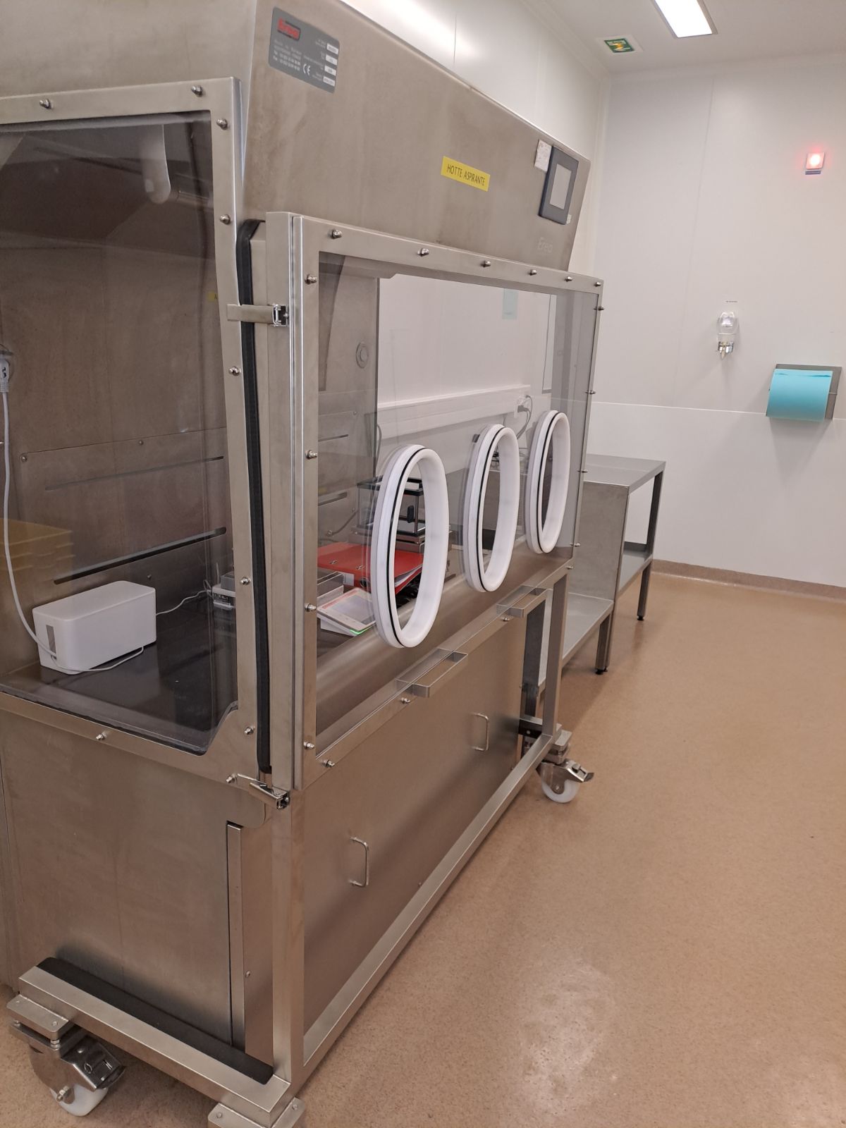 This module connect itself to the main equipment which is an EREA PHARMA Biosafety cabinet dating back to the year 2006 (BSC of type 1). The completed equipment use is the manipulation and the work on toxic products. The panel is composed of 3 glove ports, a mechanical joint, and wheels making it easier to move.