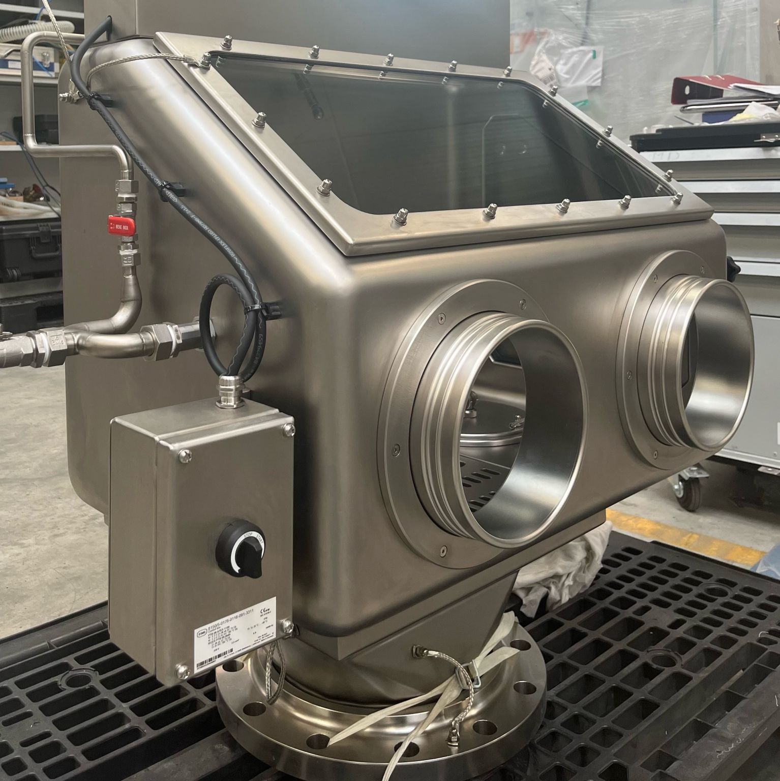 At the request of one of our customers, we made this small isolator, technically called Glove Box. This model is an ATEX version, which means that the handling of the powder can generate an exploding risk that we must consider in the design and the production of this type of equipment.